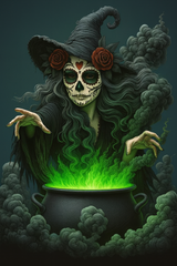 This hauntingly beautiful artwork features a witch in flowing black robes brewing a glowing neon green potion under a full moon. A black cat perches on her shoulder as ominous purple and orange smoke swirls around the cauldron, creating a chilling yet captivating gothic aesthetic. Styled within a vintage Victorian-inspired frame design, this illustration makes a striking Halloween display or year-round gothic wall art centerpiece.