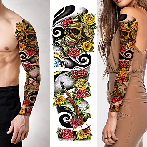 2 Sheets Full Arm Temporary Tattoos -Waterproof Fake Tattoos With Realistic Skull Flower Clock Gun Pattern Old School Body Art For Men Women Cute Leg Sleeve Tattoos Stickers For Adults Kids That Look Real