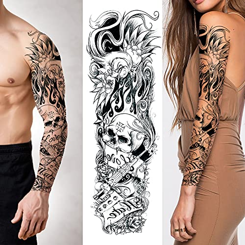 2 Sheets Temporary Tattoo Sticker-Waterproof Cool Arm Leg Back Body Sleeve Fake Tatoo For Women Men Adult Kids Long Lasting Temp Tatoos With Realistic Skull Pattern For Halloween Party Masquerade
