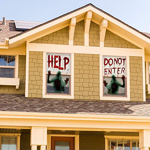- [CREEPY BLOODY SCARY HALLOWEEN PATTERN DECORATIONS]Printed with the words “HELP US”” DO NOT ENTER”. From the inside during daylight hours it looks like a bloody people is outside trying to get in. From the outside at night with a light inside it looks like a bloody people is inside trying to get out.