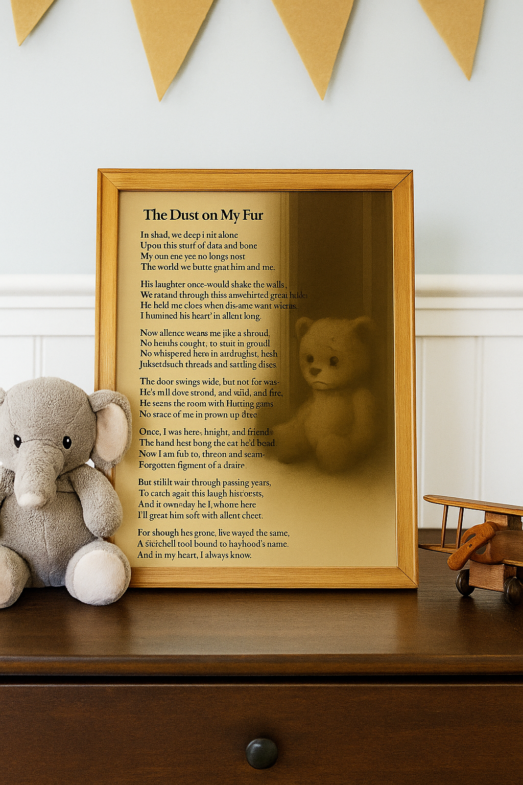 This touching digital artwork titled “The Dust on My Fur” is an original poem written by Kelly VanFossen. It captures the heartfelt story of a beloved teddy bear waiting in silence for the boy who once loved him. Delivered in warm sepia tones with soft vintage lighting, this printable poem serves as a deeply emotional tribute to childhood, memory, and unconditional love. Ideal for nurseries, boys’ bedrooms, keepsake corners, or memorial displays, this piece speaks to the inner child in us all.