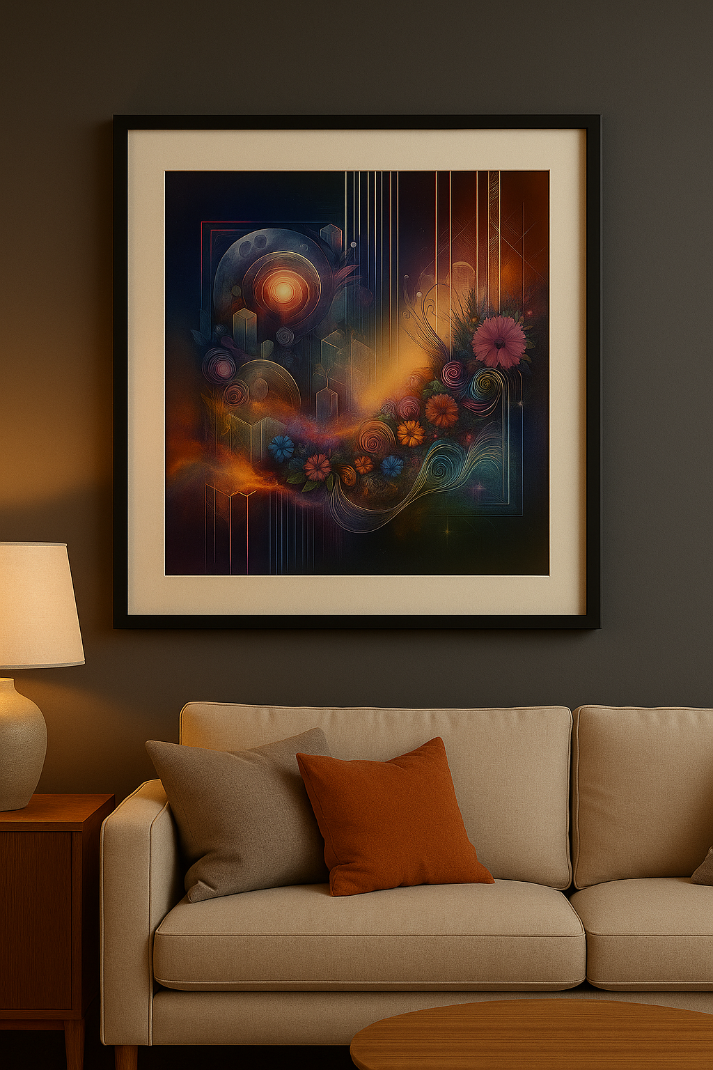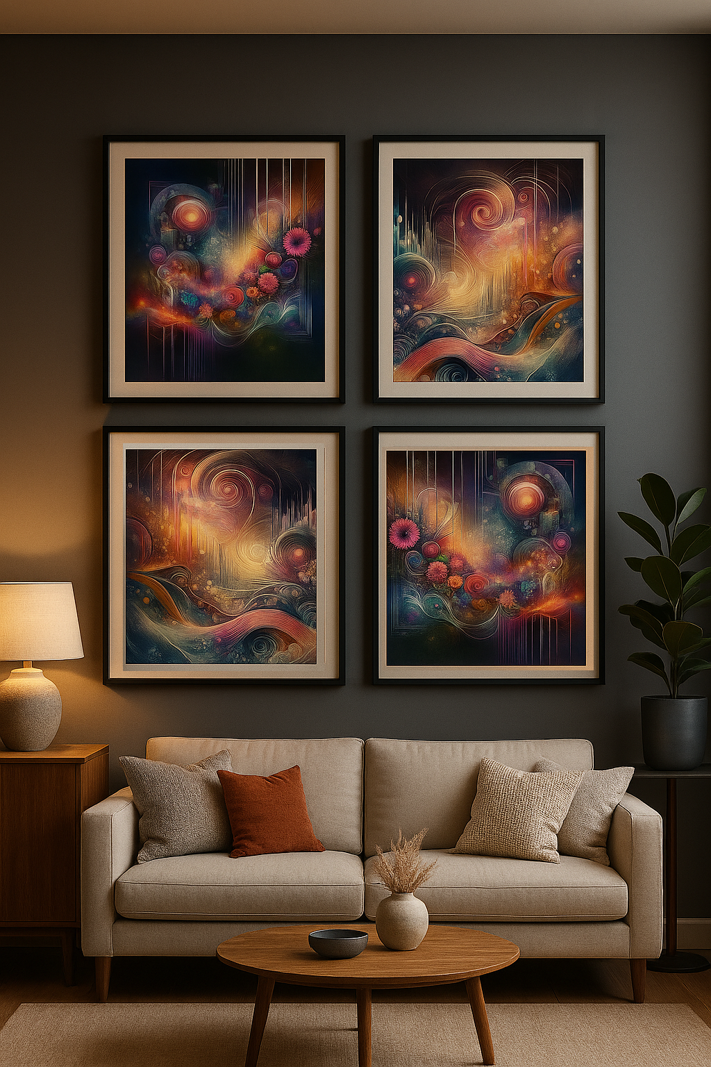 Set includes four digital artworks with abstract cosmic designs, combining geometric shapes, glowing energy lines, floral elements, and spiral motifs. The images are shown framed in a living room for visual inspiration only. All artwork is supplied as SVG digital files, ensuring sharp, high-resolution results even when scaled to large formats. These digital files can be printed on canvas, poster paper, metal, or fabric. The vibrant color palette and flowing composition make them perfect for spiritual, artistic, or sci-fi-themed spaces. Note: frames and furnishings shown are for display only and are not included.