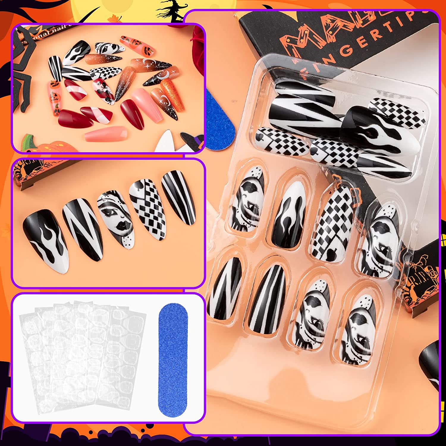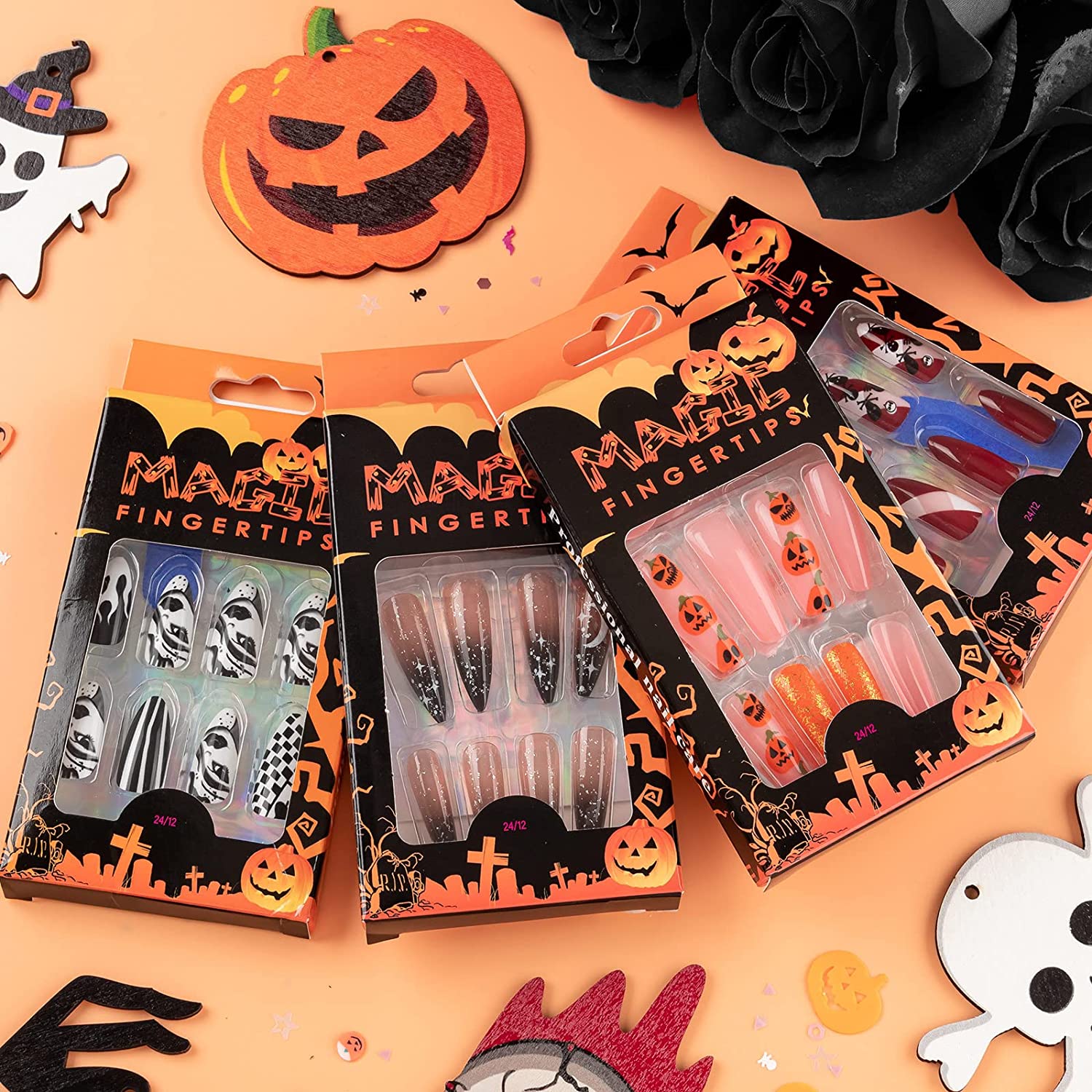 - Fun Addition for Costume Let's pulls off a showstopper! The acrylic full cover Halloween nails have different patterns design related to Halloween, including lots of classic Halloween elements: pumpkin, spider, ghost and so on, which will help you feel the festive atmosphere more intimately.