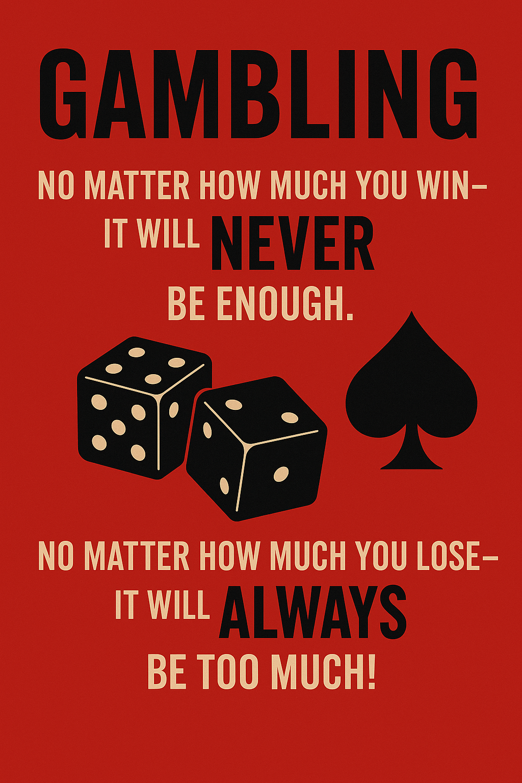 Powerful and thought-provoking, this vintage-style poster is designed to raise awareness about the dangers of gambling addiction. Featuring bold typography and symbolic imagery like dice, playing cards, and a spade, the message reads: