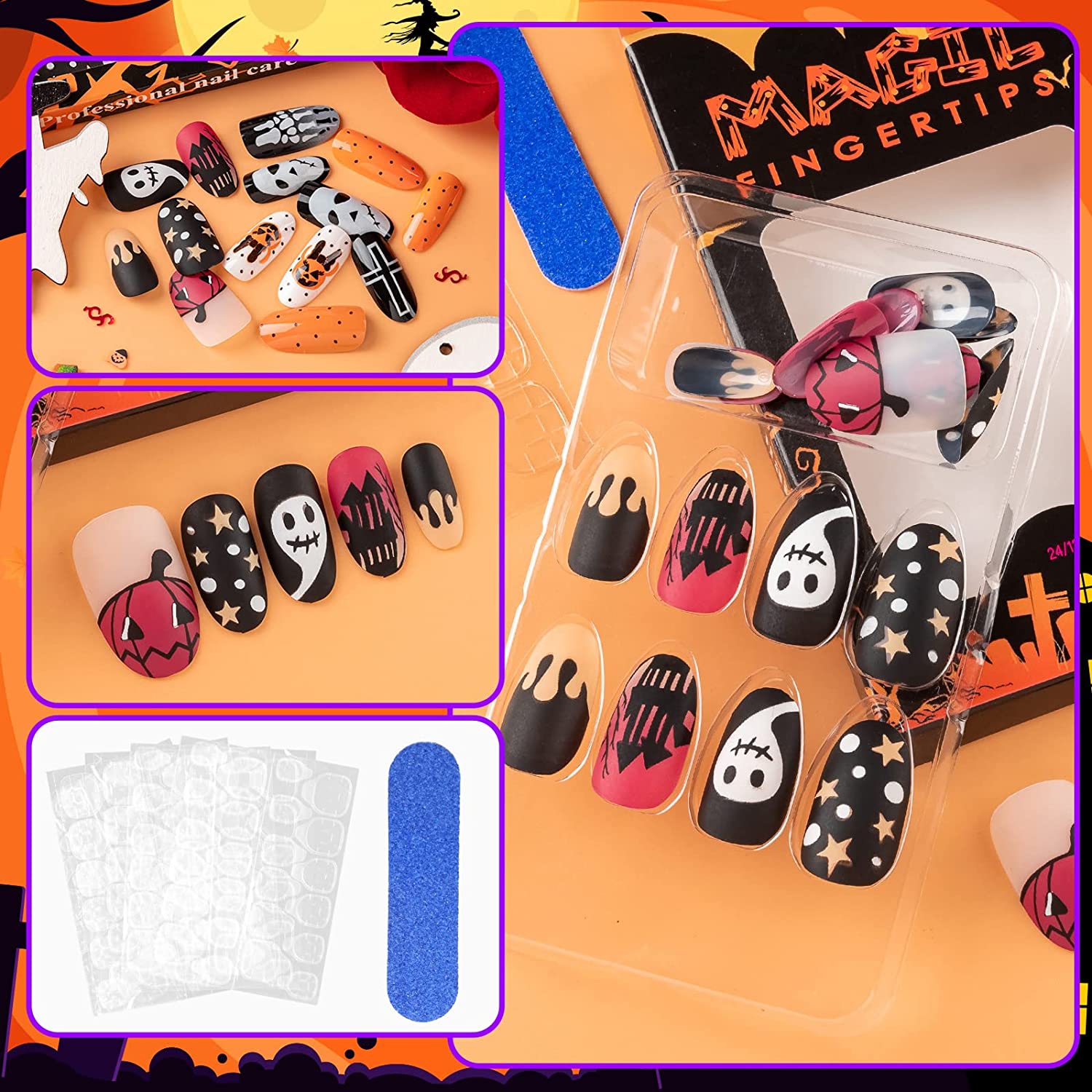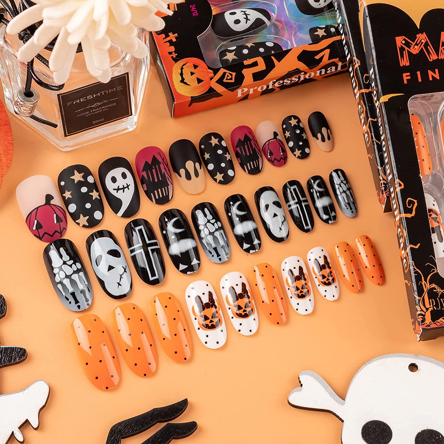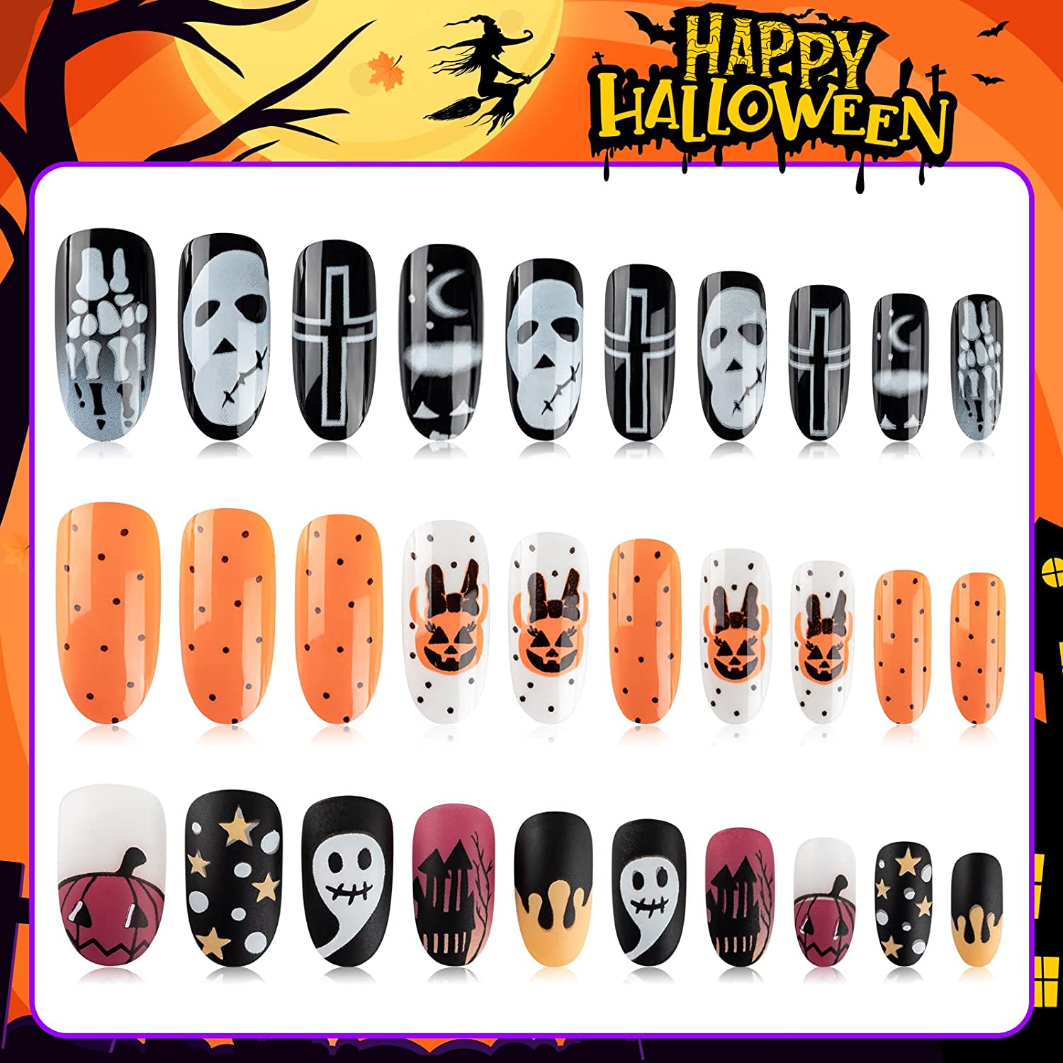 - Fun Addition for Costume Let's pulls off a showstopper! The acrylic full cover Halloween nails have different patterns design related to Halloween, including lots of classic Halloween elements: pumpkin, spider, ghost and so on, which will help you feel the festive atmosphere more intimately.