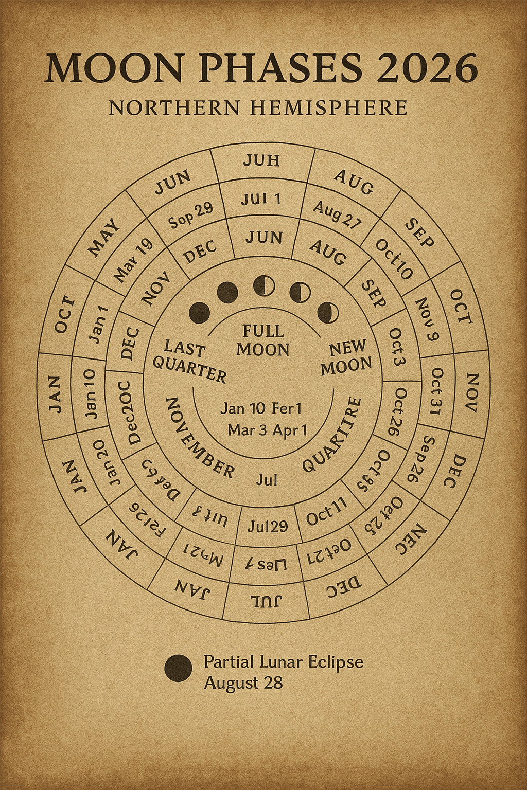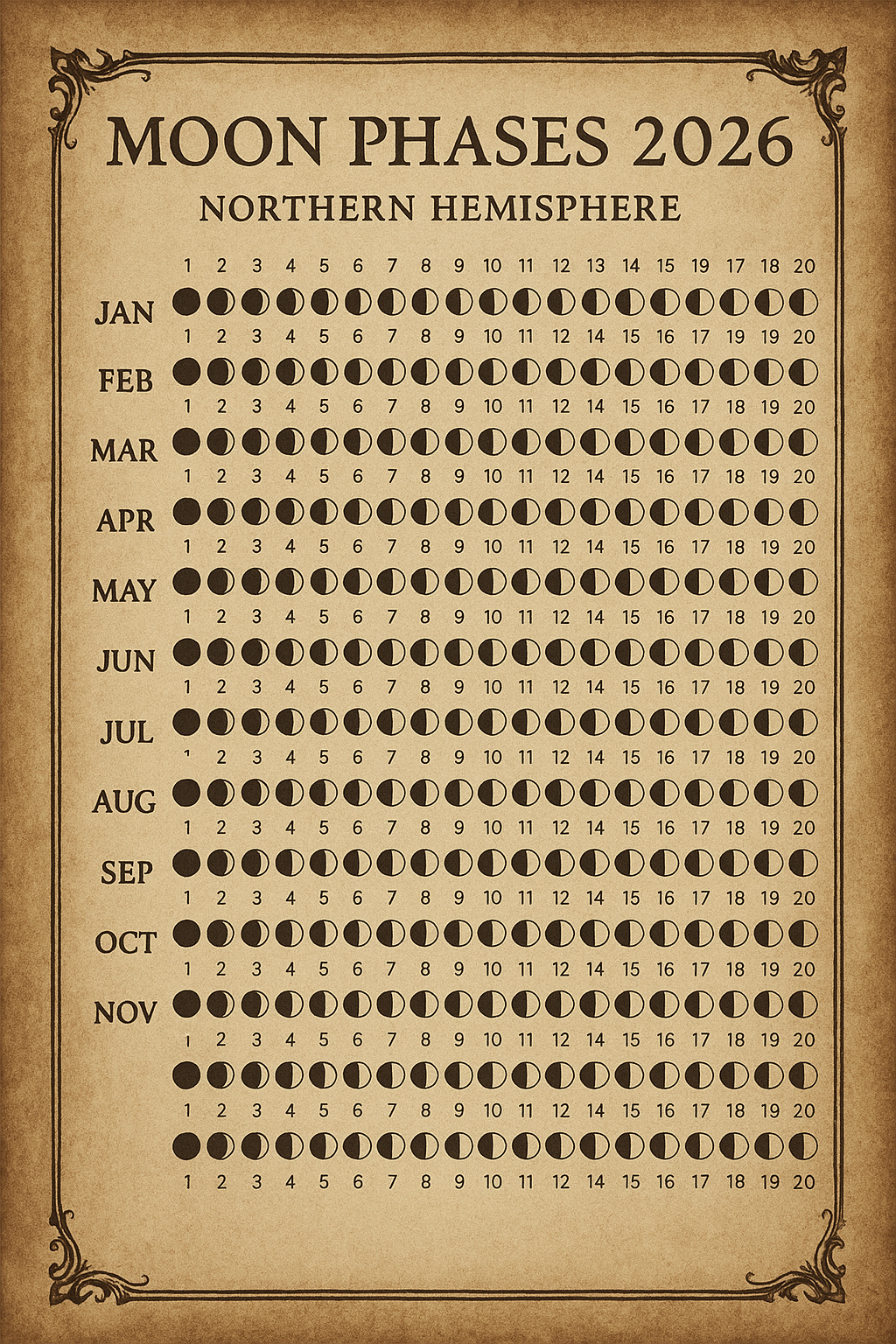 moon calendar 2026, lunar phases chart, moon wall art, astrology planner page, witchcraft decor, grimoire printable, moon cycle tracker, full moon guide, spiritual calendar, northern hemisphere moon, printable lunar art, moon magic calendar, new moon tracker,