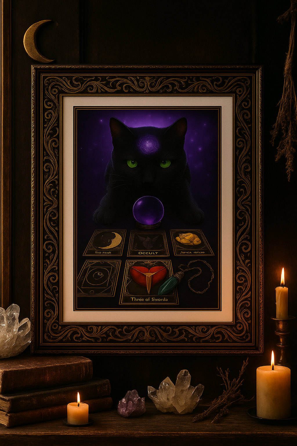 Download this magical 4K artwork featuring a mystical black cat with piercing green eyes, a glowing third eye, and a crystal ball resting between tarot cards. Each element—from “The Moon” and “Ace of Wands” to “Three of Swords”—evokes spiritual symbolism and divination energy. The design glows with moody purples, golden detailing, and a dark fantasy vibe ideal for home décor, altars, or ritual spaces.