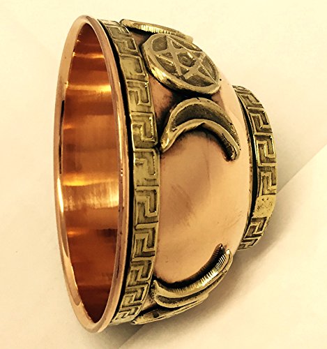 Details: Triple moon pentacle symbol copper offering bowl 3" diameter. Made of cooper. Size: 3" diameter. Product dimensions: 3 x 3 x 2 inches. Quality product by New Age Imports, Inc.