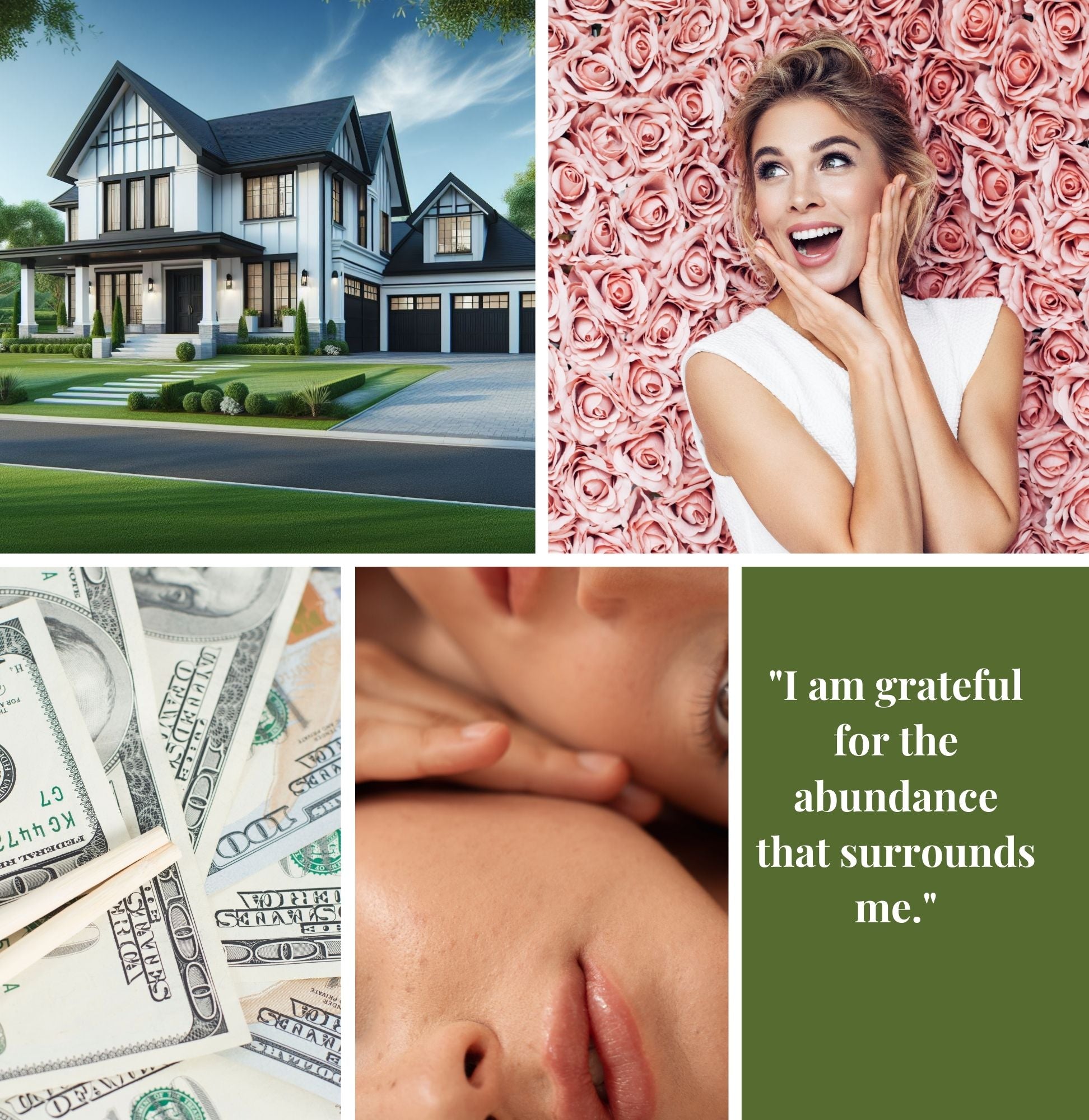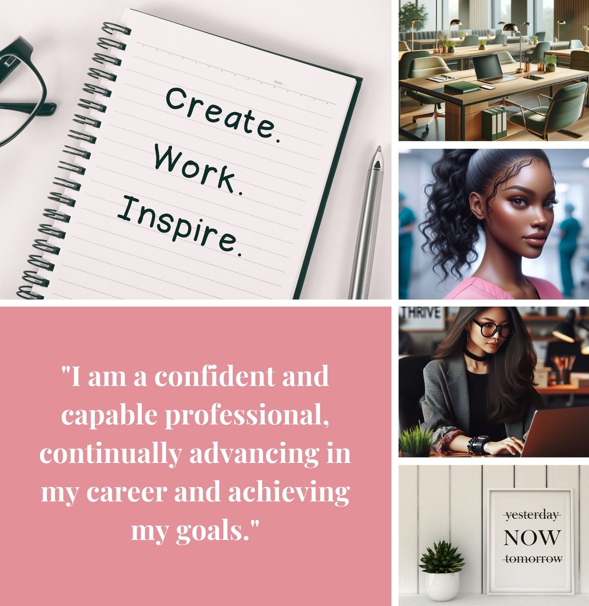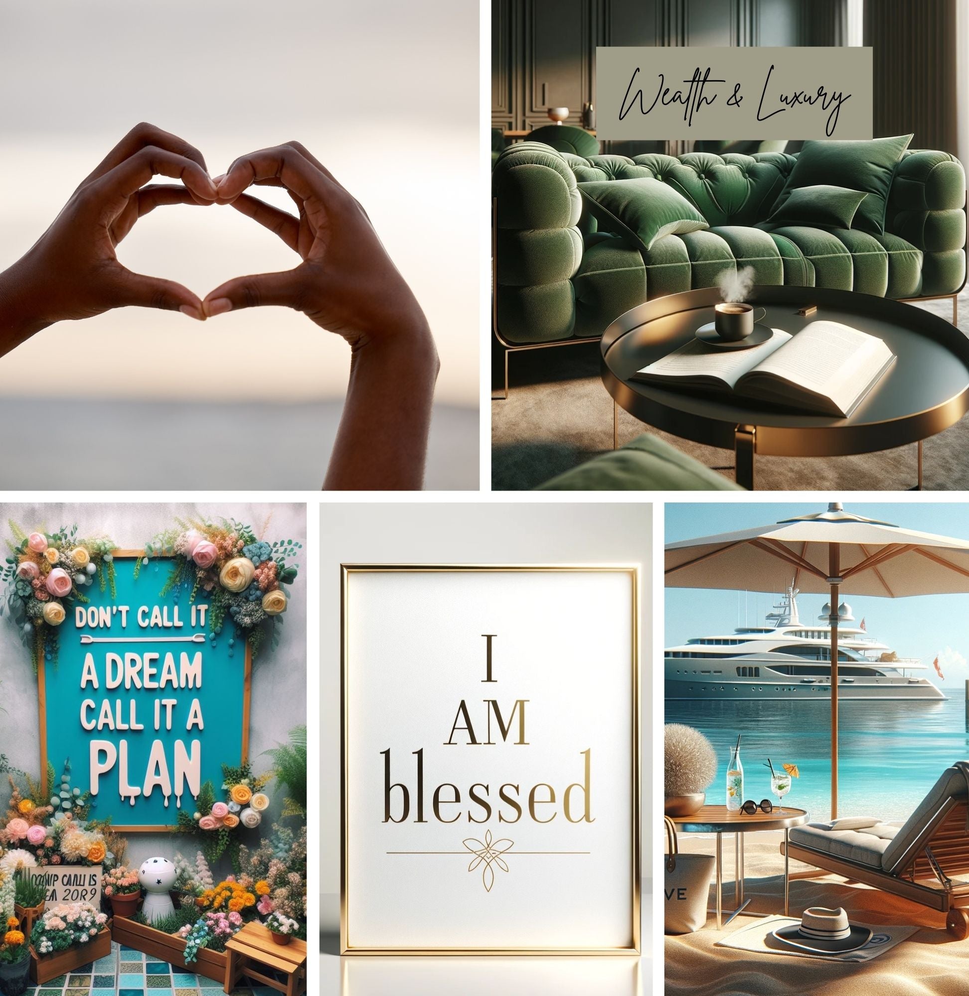Vision board printable kit with over 300 aesthetic elements including motivational quotes, cut-and-paste images, and affirmations. Designed for manifestation, journaling, or goal setting. Includes digital files for download, ideal for printing or digital planning. No shipping. Created by aspell4u.com.