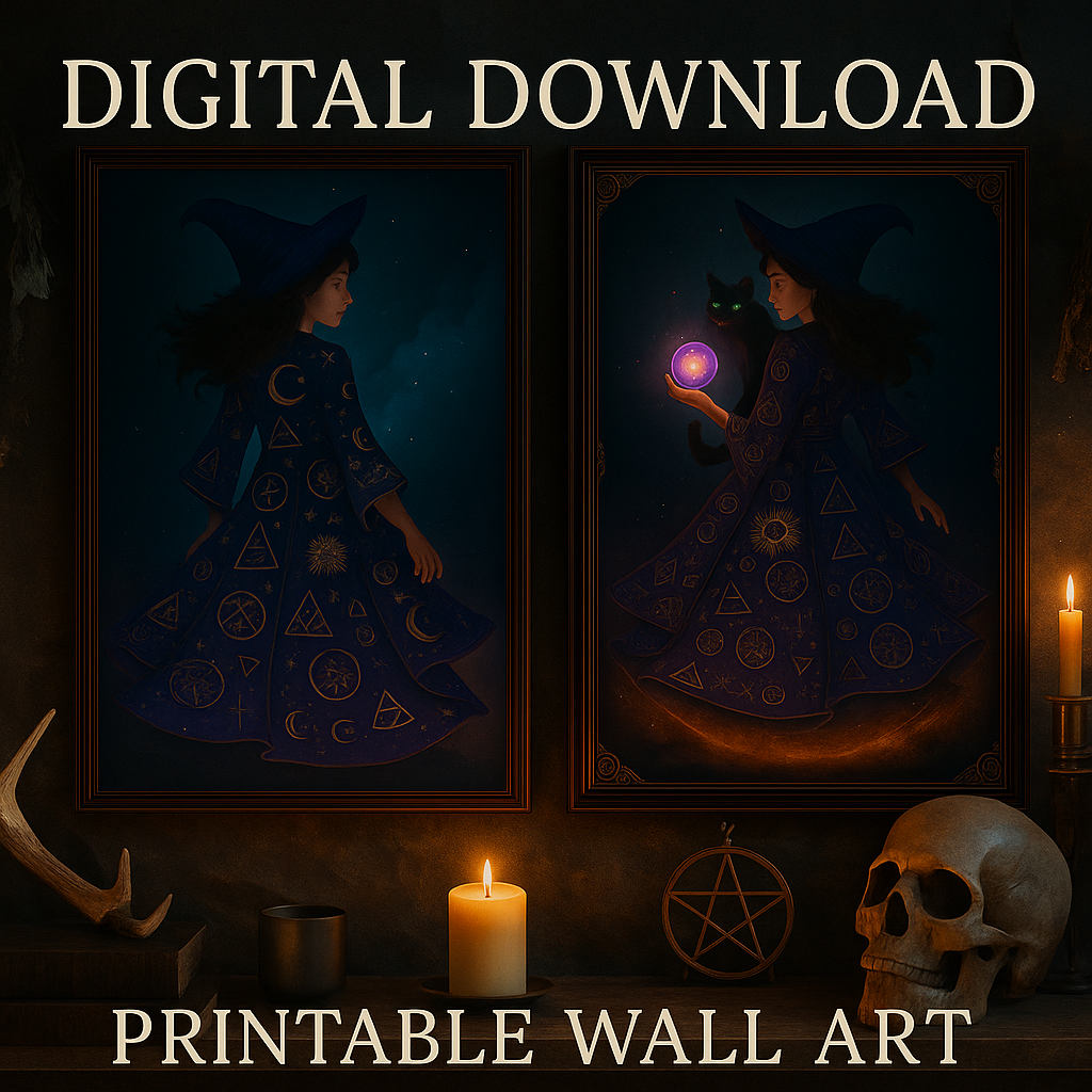 You’ll receive two separate high-resolution digital files, each designed for crisp, professional-quality printing up to 18x24 inches or scaled down for smaller frames. Each piece features ornate linework, rich deep blues and purples, and warm glowing light that highlights the symbolism throughout—perfect for spell rooms, reading nooks, dorm walls, or Halloween décor with year-round enchantment. Download, print, and display your magic instantly—no waiting, shipping, or rituals required.