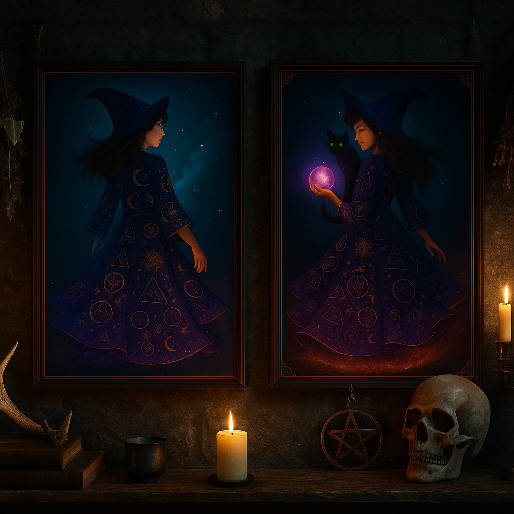 Embrace magical mystery with this stunning set of two coordinated witch-themed digital art prints. Featuring beautifully illustrated sorceresses in celestial robes adorned with ancient symbols, this duo adds a perfect balance of mystery and elegance to your home, altar, or sacred space. One artwork captures a quiet, starlit moment as a witch gazes into the night sky, while the second shows her counterpart conjuring energy with a glowing purple orb, a green-eyed black cat perched on her shoulder. Designed in a rich dark academia and witchcore aesthetic, these prints are ideal for modern mystics, fantasy lovers, or those drawn to esoteric beauty.